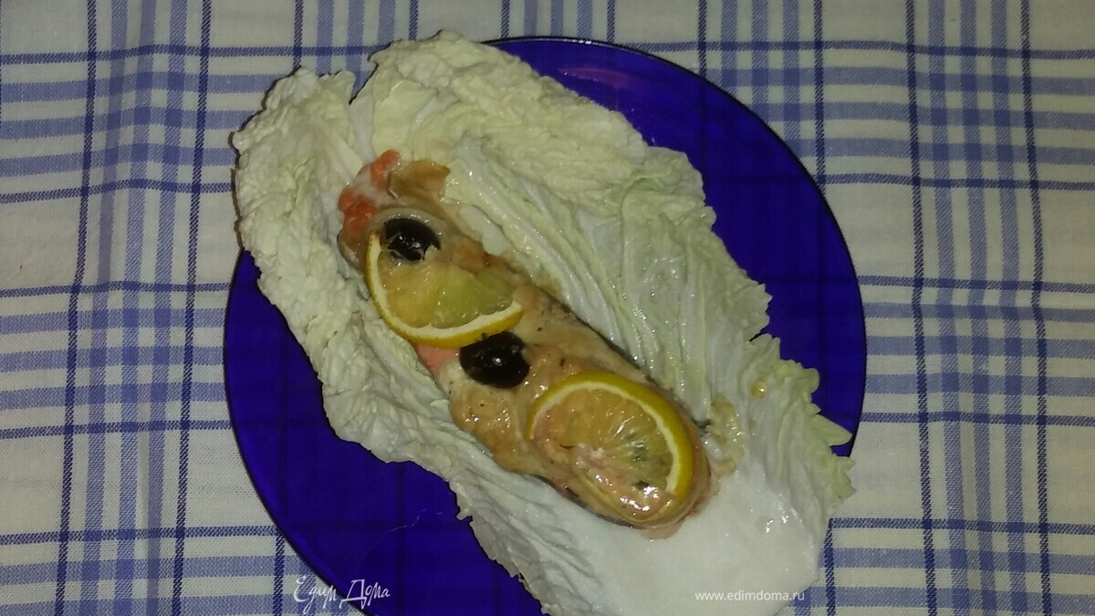 Затем противень застилаем бумагой для выпечки и смазываем ее оливковым маслом. Лимон нарезаем кружочками из расчета 1 кружок на 1 кусочек рыбы. Затем разрезаем кружочки лимона пополам. Так же порционно нарезаем репчатый лук. Затем колечки репчатого лука распушаем руками. Маслины нарезаем половинками. Затем на противень выкладываем кусочки рыбы, на них — репчатый лук, дольки лимона и половинки маслин. Затем поливаем кусочки рыбы соусом. Ставим противень с рыбой в разогретую до 180°C духовку на 20 минут (время зависит от вашей духовки). Перед подачей на каждую тарелку кладем лист китайского салата, а на него уже кусочек запеченной рыбы. Приятного аппетита!