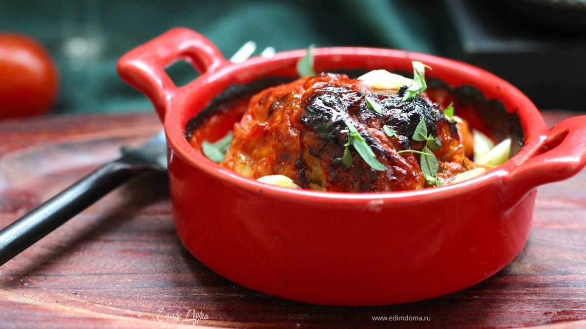 Влейте в сковороду с уже обжаренными голубцами смесь сметаны и рубленых томатов и запекайте при температуре 180°C 30–40 минут до готовности. - Шаг 4