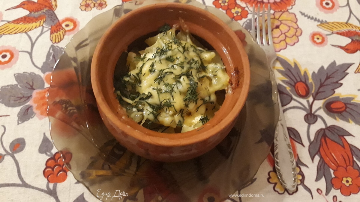 Сыр натираем на крупной терке. Мелко режем укроп. Смешиваем ингредиенты. Как только картошечка станет мягкой, посыпаем сырно-укропной смесью картофель. Ставим в духовку открытые горшчки на 3–5 минут.