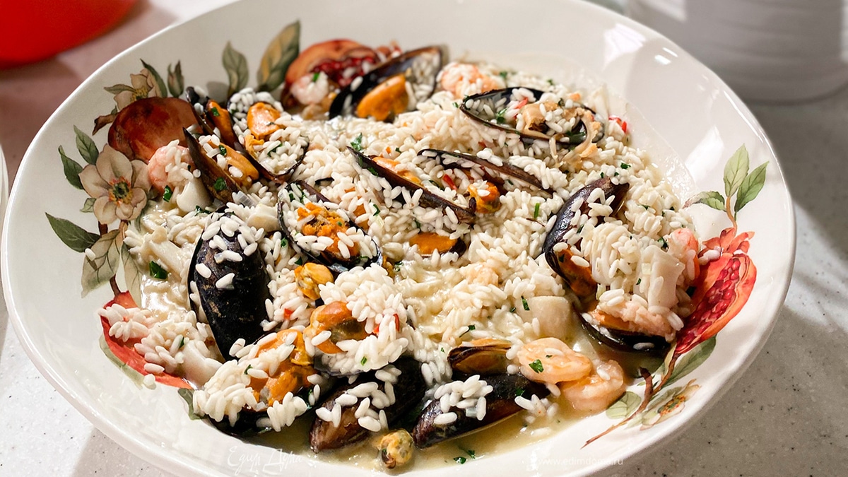Из морепродуктов подойдут свежие мидии, креветки и кальмары. Чем толще дно у сковороды, тем лучше для ризотто. Если хотите сделать блюдо менее острым, просто не добавляйте перец чили. К ризотто можно подать белое или игристое вино.