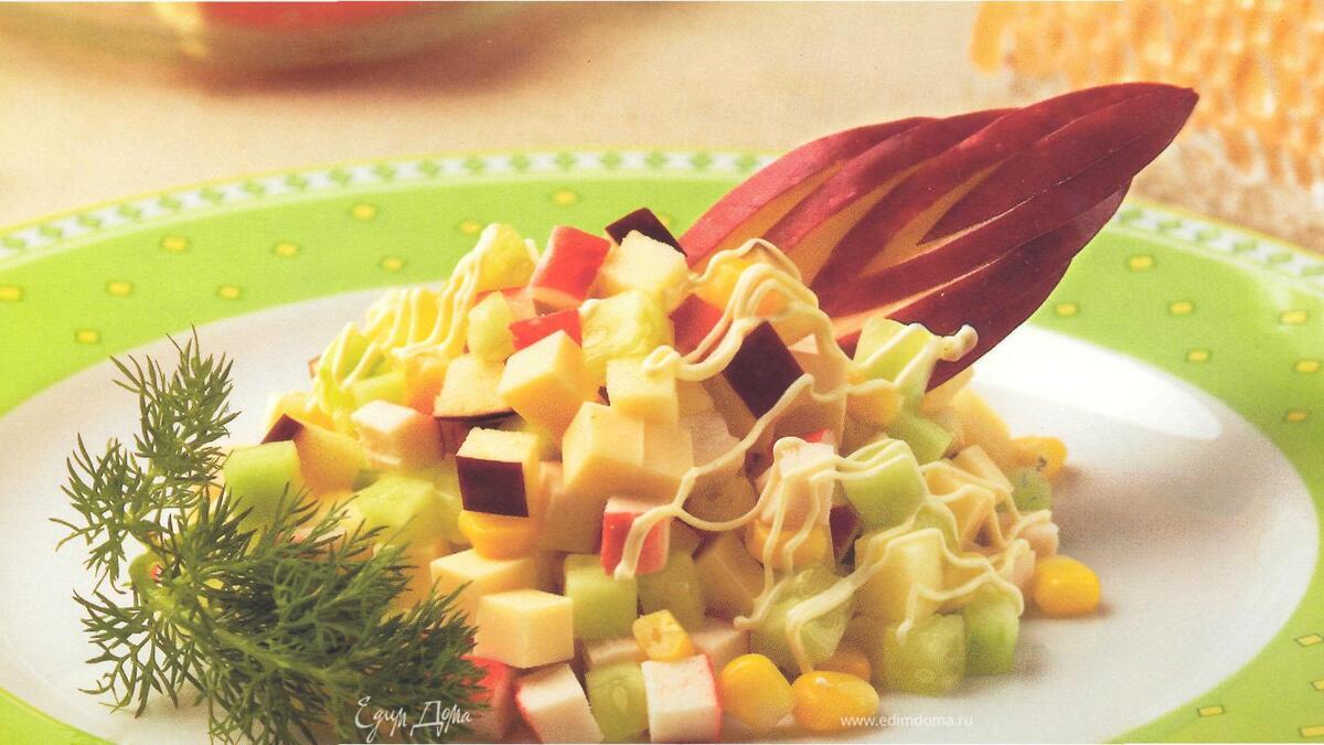 - Шаг 1Салат можно выложить слоями, смазывая каждый слой майонезом: кукуруза, сыр, огурец, крабовые палочки, затем еще раз в том же порядке, но вместо огурца - яблоко.