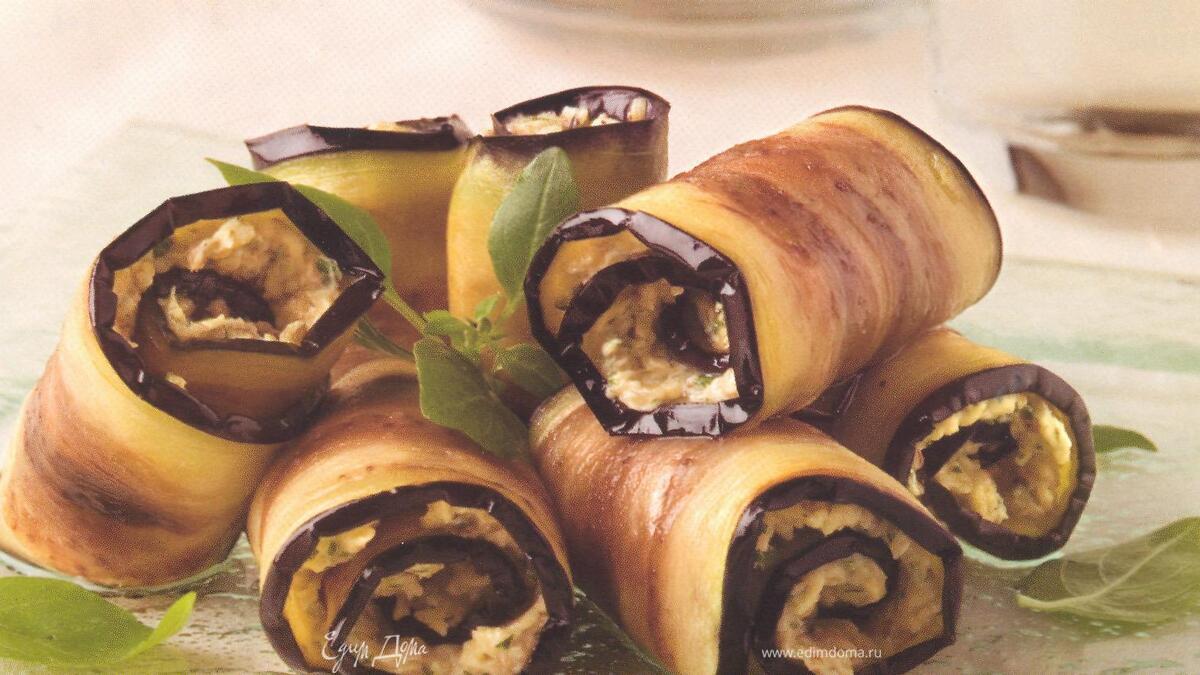 - Шаг 1Начинку выложите на ломтики баклажанов, сверните рулетики и уложите их на блюдо.