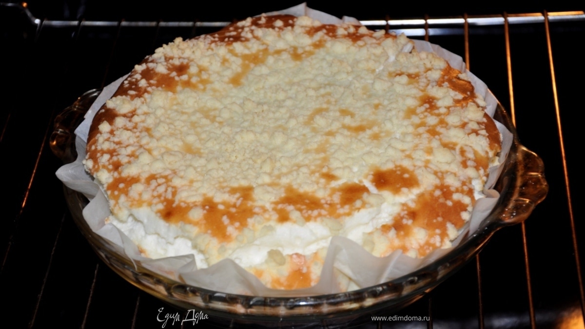 - Шаг 4Достаем слегка испеченое тесто и укладываем нашу творожную массу. Сверху посыпает крошкой-тестом, которое мы оставили загодя.