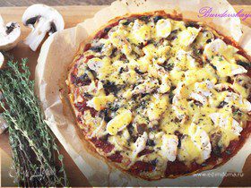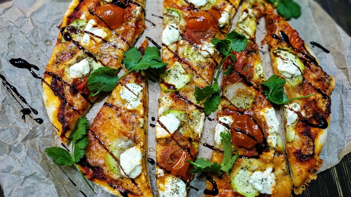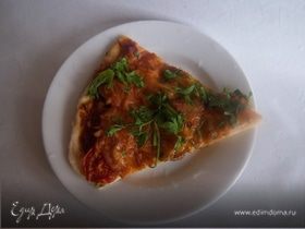 Полила сверху бальзамическим соусом и добавила свежую зелень (по вкусу). Пицца получилась сочная и вкусная. Приятного аппетита.