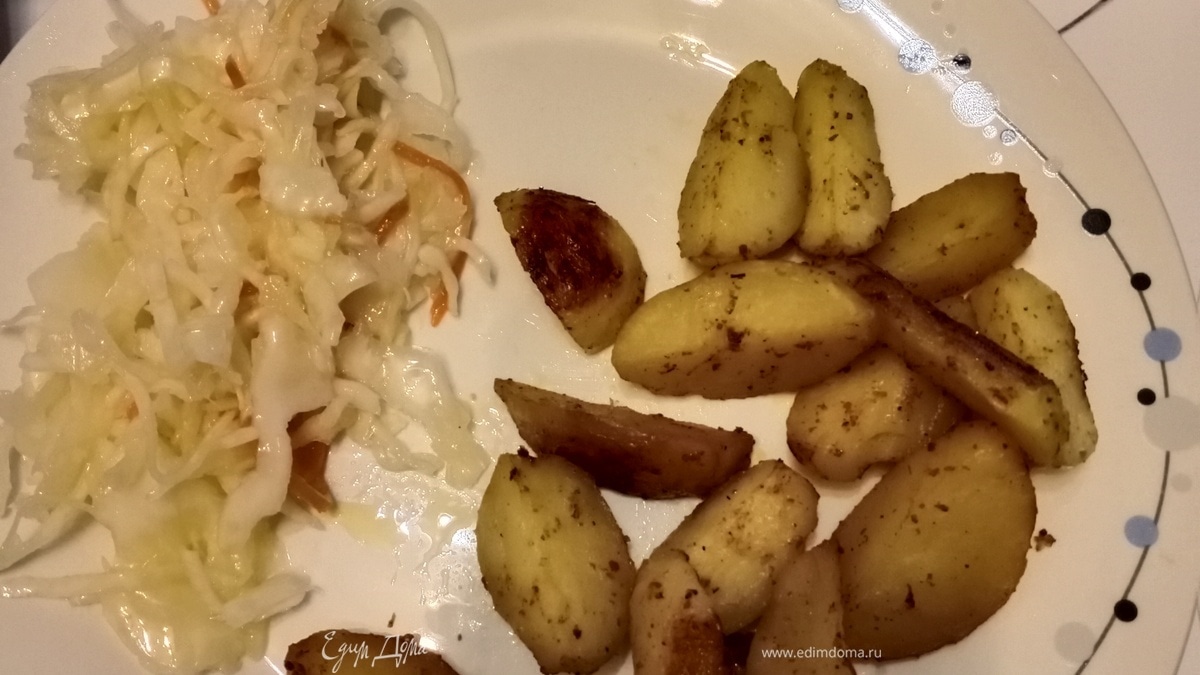 Выложить картофель в посуду для запекания и отправить в разогретую духовку минут на 15–25. Ориентируйтесь на мощность духового шкафа и на свое предпочтение «зажаристости» картофеля. Желательно не пересушить. Готовый картофель — прекрасный гарнир для рыбы. Подойдет и для мяса. Ну а на наш взгляд, это замечательное самостоятельное блюдо, которое очень дружит с квашеной капустой) Приятного аппетита!