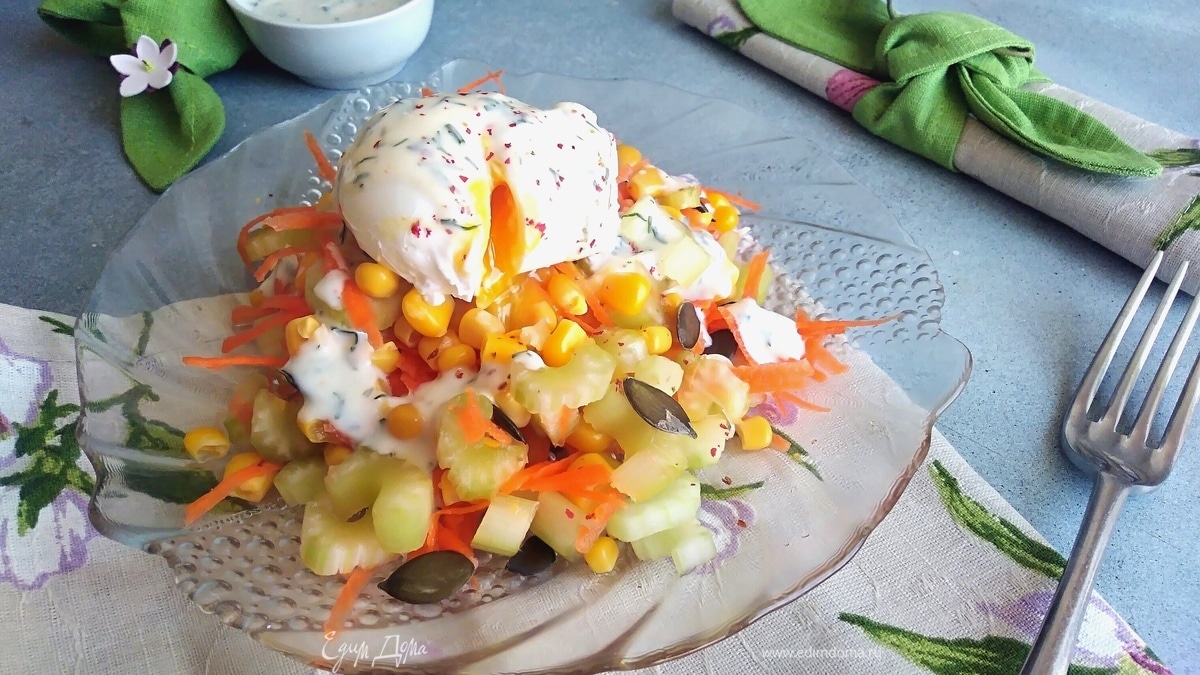 Салат с сельдереем, яйцом-пашот и заправкой из ряженки