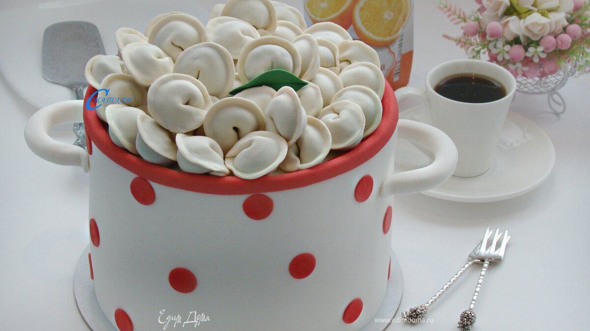 С помощью сахарной мастики торт украсить по своему вкусу. Сверху уложить шоколадные пельмени. Можно подавать к столу.