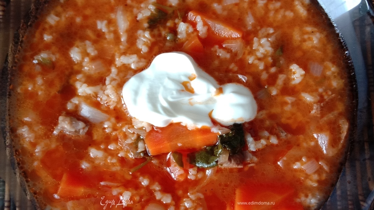 Вот и все. Суп готов! Дадим ему настояться минут 10 для разбухания риса. Выкладываем в тарелку, добавляем сметану. Приятного аппетита.