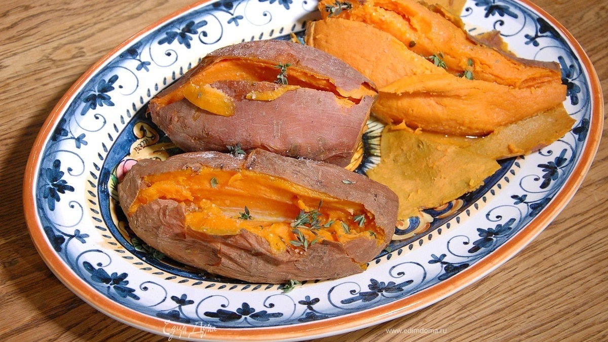 В Англии это назвали бы baked potato — там очень любят запеченную картошку и по-всякому ее фаршируют, а многие повара сейчас вместо обычной картошки используют и батат. Можно, как я, добавить только сливочное масло, немного соли и тимьяна, а можно натереть сыра или взять чеснок и зелень — любые травки, которые вам нравятся, сюда подойдут! Это не просто вкусная еда, но и вполне себе полезная!