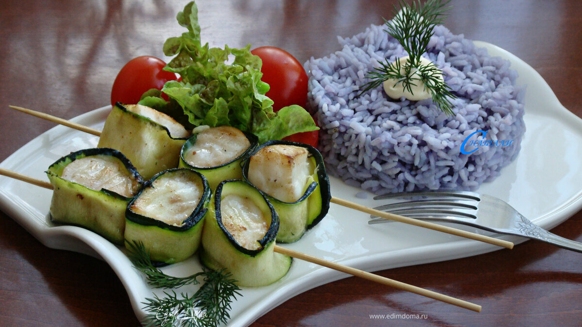 Кусочки рыбы завернуть в кабачковые слайсы и нанизать на деревянные шпажки. Емкость комплекта Steam Plus Pot смазать растительным маслом и уложить рыбные шашлычки. - Шаг 10