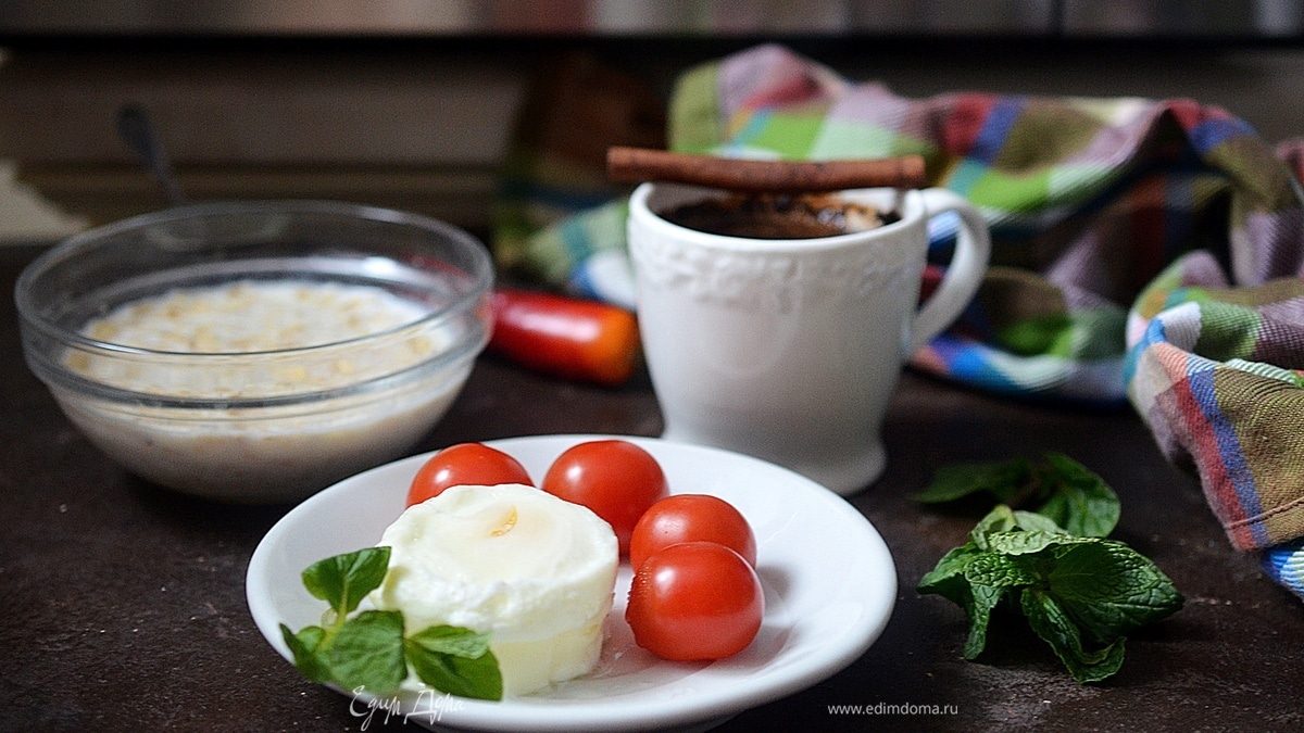 Овсяная каша, яичница в стакане и чашка ароматного кофе готовы. Ничего не надо помешивать, не надо бояться, что что-то «убежит». Приятного аппетита!