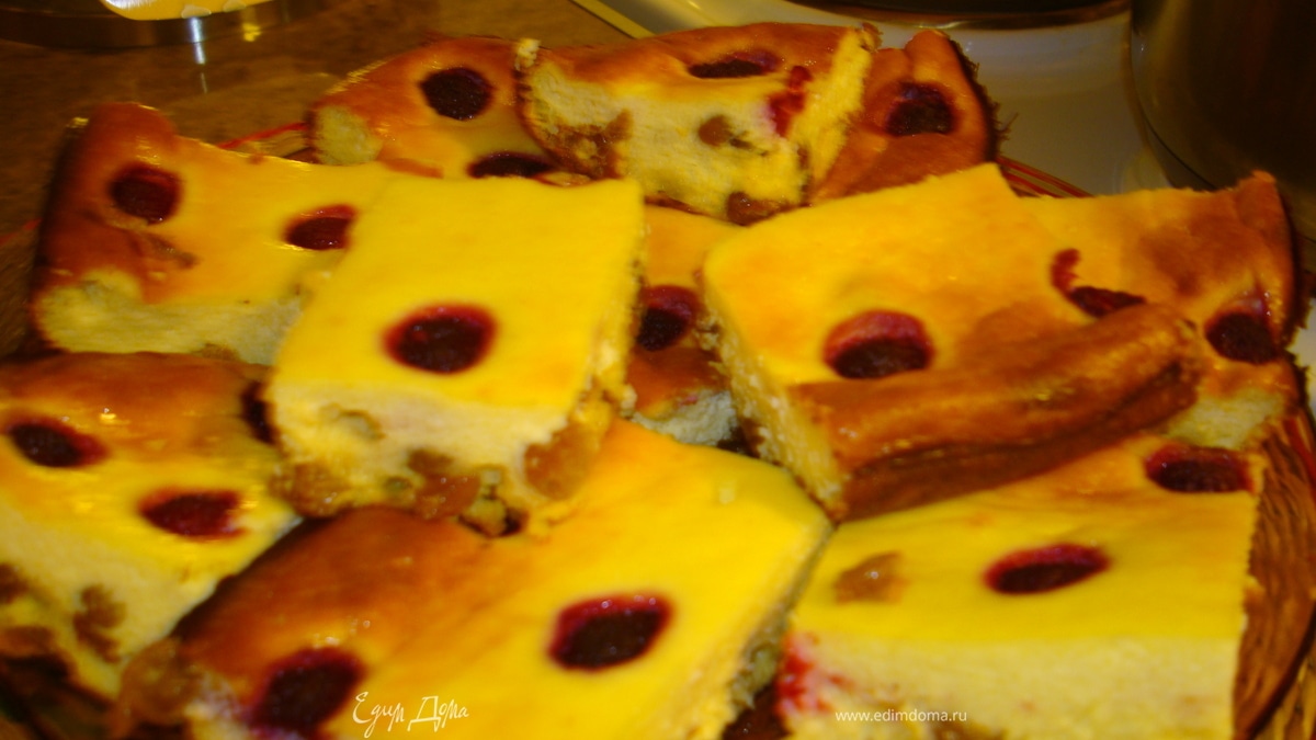 Творог растереть с сахаром. Добавлять по 1 яйцу.Затем сметану.Изюм залить теплой водой, слить и также добавить в творожную массу.Добавить 1 ложку маннки, всё хорошенечко вымешать. Тесто получается жидкое, как на блины. Форму для выпекания смазать сливочным маслом.Духову разогреть до 200*.Массу вылить в форму и украсить сверху малиной и отправить в духовку на 40 мин.