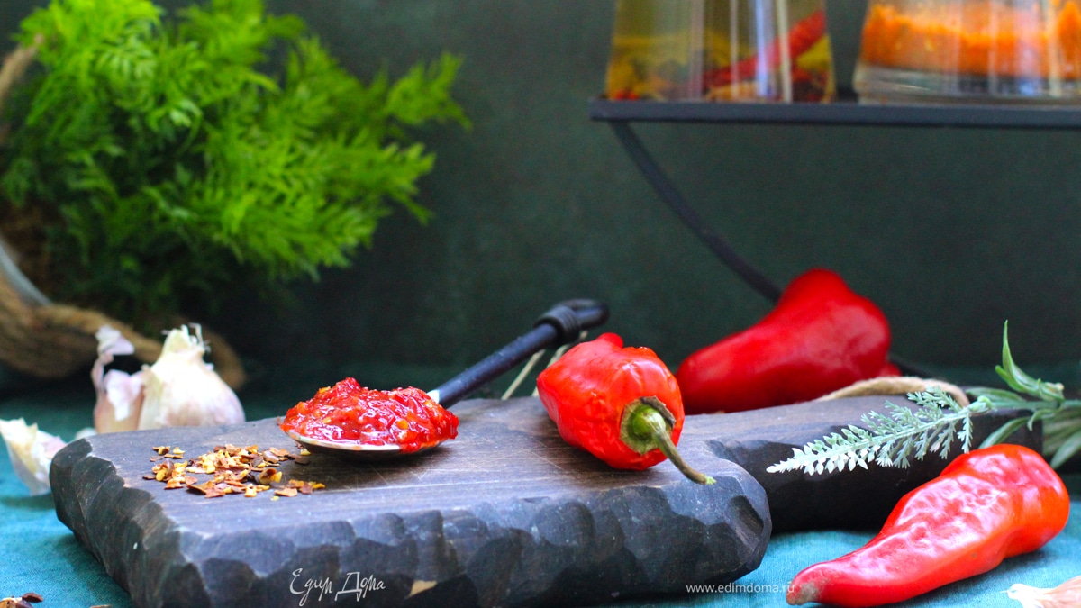 Чистим чеснок. Перец и чеснок режем крупными кусками и складываем в чашу блендера или измельчителя. Туда же отправляем все остальные ингредиенты. Промалываем до получения однородной массы. Все, наша перечная паста готова! - Шаг 3