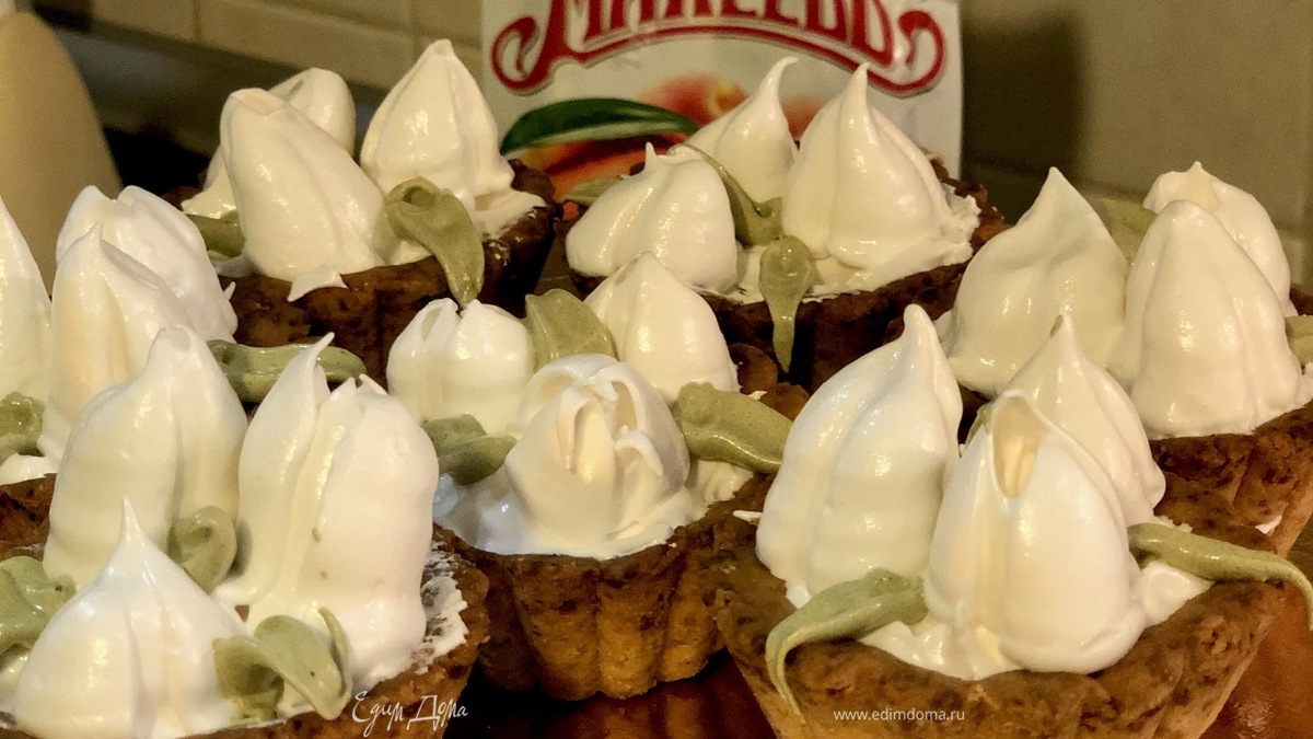 С помощью кондитерского мешка отсадить белковый крем в корзинки. Крем для листочков окрашен чаем матча.