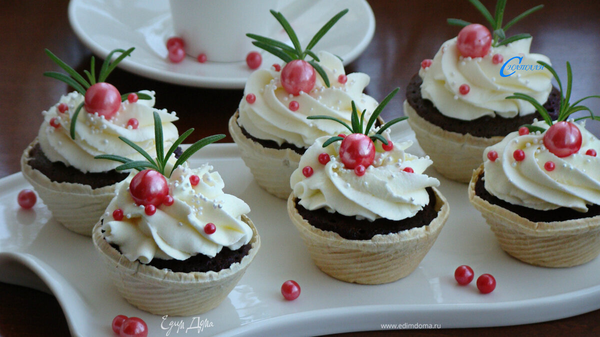 Для кремовой шапочки в миске взбить все ингредиенты сразу: сливочный сыр, сливки, сахарную пудру и щепотку ванилина. Переложить крем в кондитерский мешок с насадкой и отсадить шапочки. Все. Наши вкусные шоколадные капкейки готовы! Быстро, просто, вкусно!
