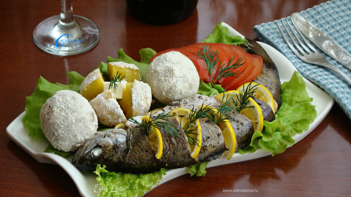Буквально за полчаса готов вкусный обед или ужин с печеным картофелем и ароматной форелью.