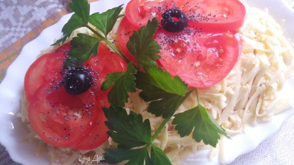 Украсить салат. Из черри сделать цветы. Добавить веточку зелени. Маслины разрезать пополам, сделать серединку цветка. Посыпать маком. Дать настояться салату в течение 1 часа. - Шаг 9