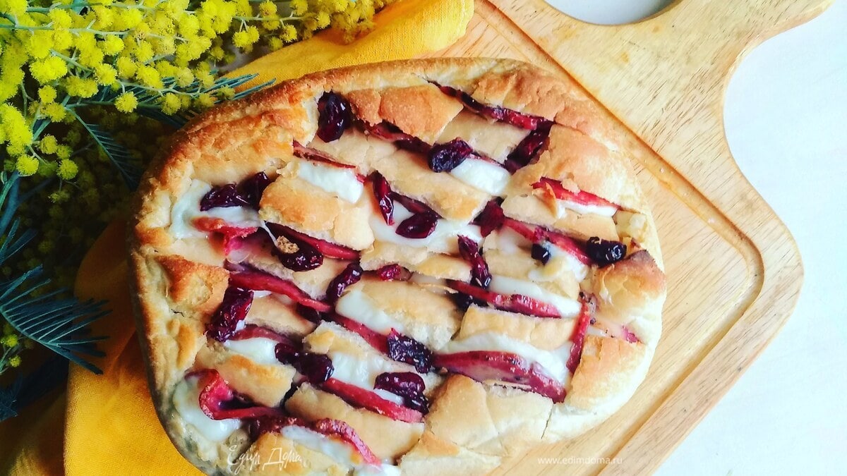 Укладываем нашу начинку и сверху посыпаем клюквой. Отправляем в разогретую духовку на 10–15 минут.