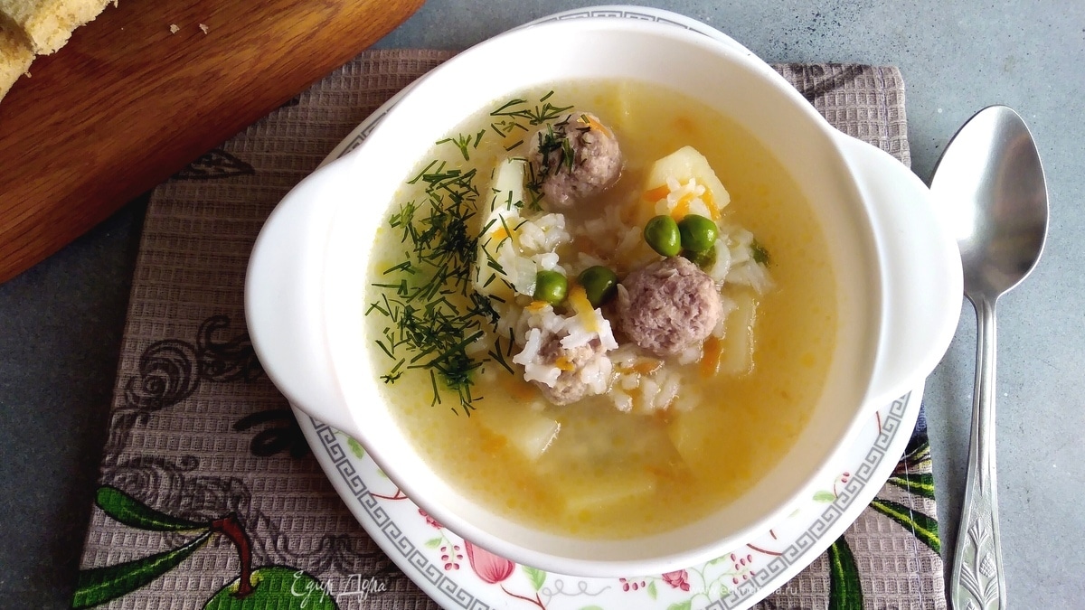 Суп с рисом, фрикадельками и горошком
