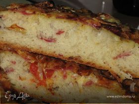 Красивый, хорошо сформированный мякиш с вкраплениями томатов и жареного лука.