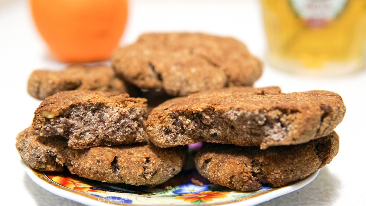 Заливаем полученную жидкость в емкость с мучной смесью. Месим до состояния однородного теста руками или с помощью бытовой техники. Далее упаковываем в пищевую пленку и отправляем в холодильник на 30 минут. - Шаг 4Достаем тесто из холодильника, подготваливаем емкость с водой для смачивания рук. Разогреваем духовку до 180°С. В это время выстилаем противень ковриком для выпечки. Смачиваем руки и начинаем отщипывать кусочки теста желаемого размера, скатывать их в шарики и с помощью ладоней прижимаем их к противню, формируя плоские печенья. После прессовки можно приподнять печенье, чтобы оно точно не пригорело. Смазывать маслом коврик не требуется. После укладки всего печенья отправляем противень в духовку примерно на 25 минут.