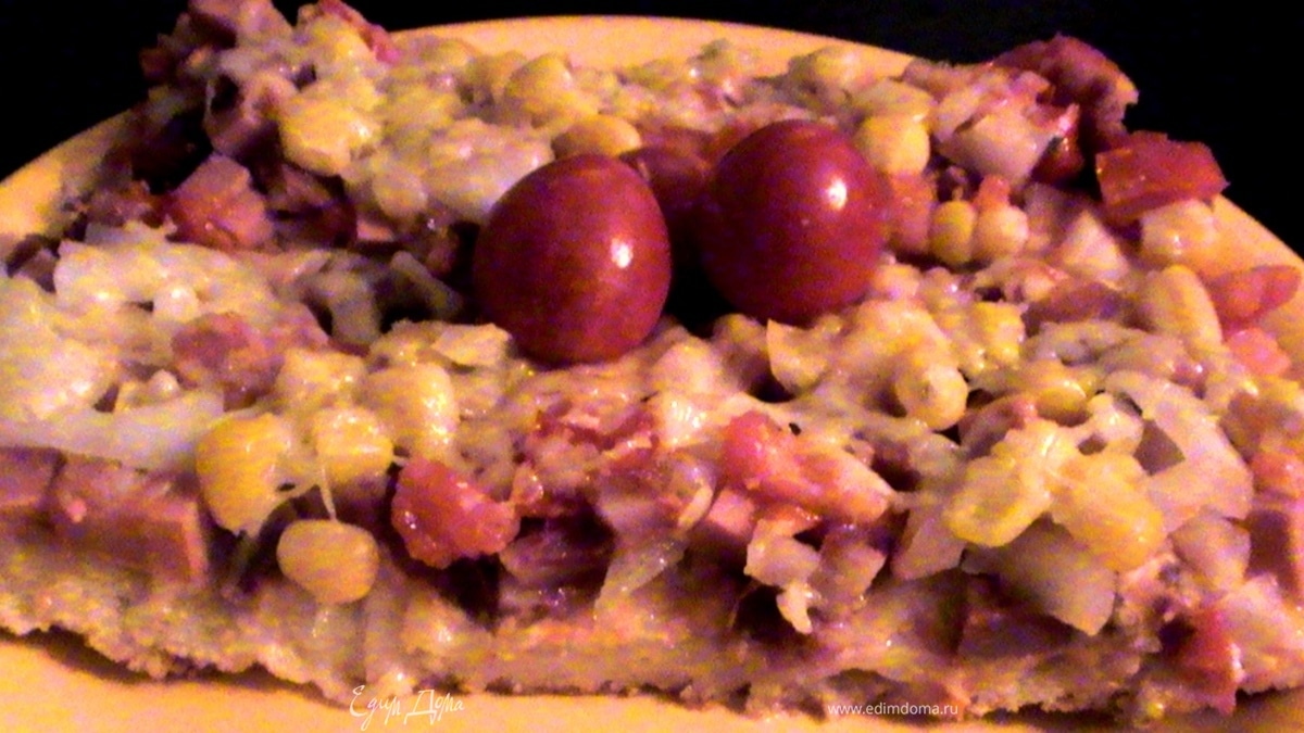 - Шаг 1Развести дрожжи в теплой воде с добавлением сахара, когда дрожжи растворятся добавить муку, соль, масло и яицо. Поставить тесто в теплое место, чтобы оно поднялось. На противень, смазанный растительным маслом, выкладываем тесто и раскатываем его на всю ширину противня. Смазываем тесто томатной пастой и ставим в духовой шкаф на 10 минут. Затем тонким слоем распределяем на пицце майонез. Выкладываем слоями порезанную небольшими кубиками колбасу, мелко порубленный лук, помидоры нарезанные полукольцами, консерированную кукурузу, натертый сыр. Ставим в разогретую духовку. Выпекаем до готовности.