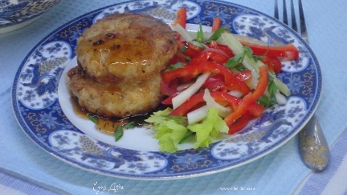Сформовать из фарша круглые котлеты. Обвалять в панировке из кукурузной муки и паприки, обжарить с двух сторон на растительном масле. Добавить в сковороду немного воды, накрыть крышкой, тушить 5 минут. - Шаг 3