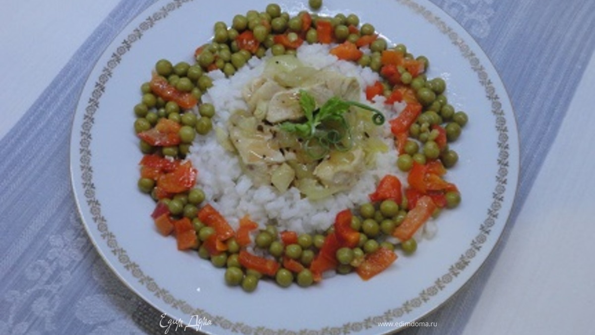 Подавать курицу по-испански рекомендуется так: на тарелку выкладывается рис, сверху — кусочки курицы. Поливаем бульоном. Я еще и бальзамическим уксусом сбрызнула. По краям тарелки — рис с перцем. Приятного аппетита! - Шаг 7