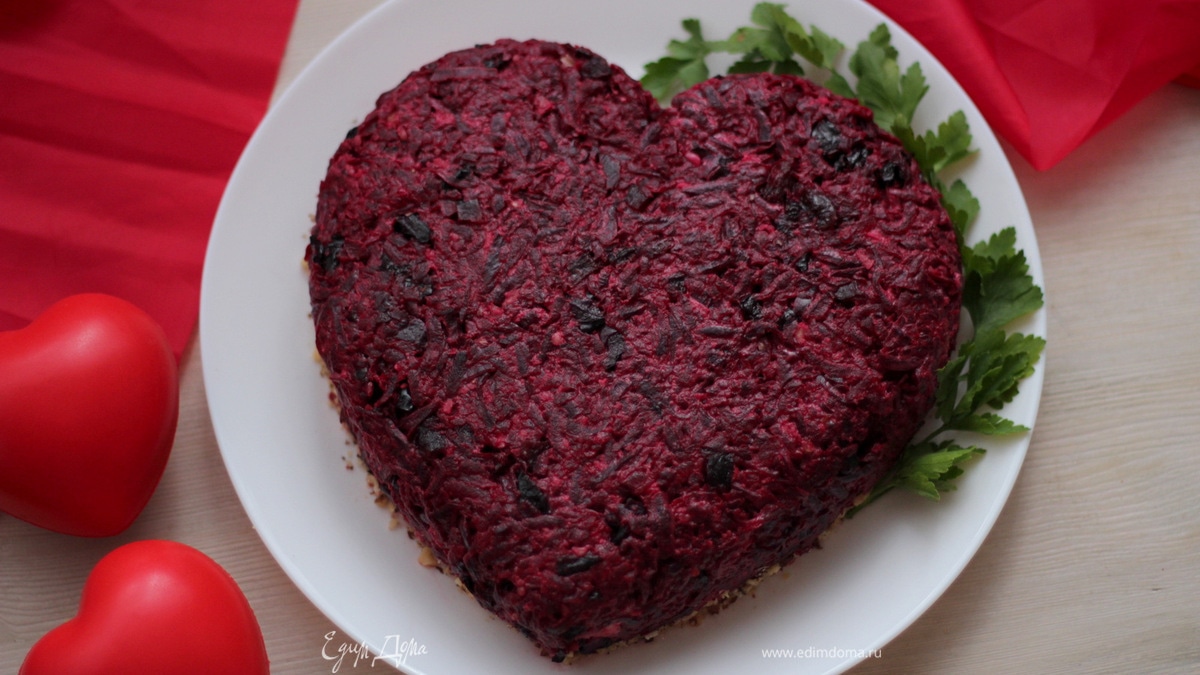 Свеклу смешать с черносливом и также добавить чесночный майонез. Это будет третий завершающий слой. Распределить свеклу по всей поверхности салата и сформировать сердечко. Удобно делать это лопаткой. Грецкие орехи положить в кулек и прокатать скалкой до мелкой крошки. Я насыпаю орехи по всему периметру сердечко из орешков. Можно просто посыпать орехами или добавить их в свеклу, на ваше усмотрение. - Шаг 12