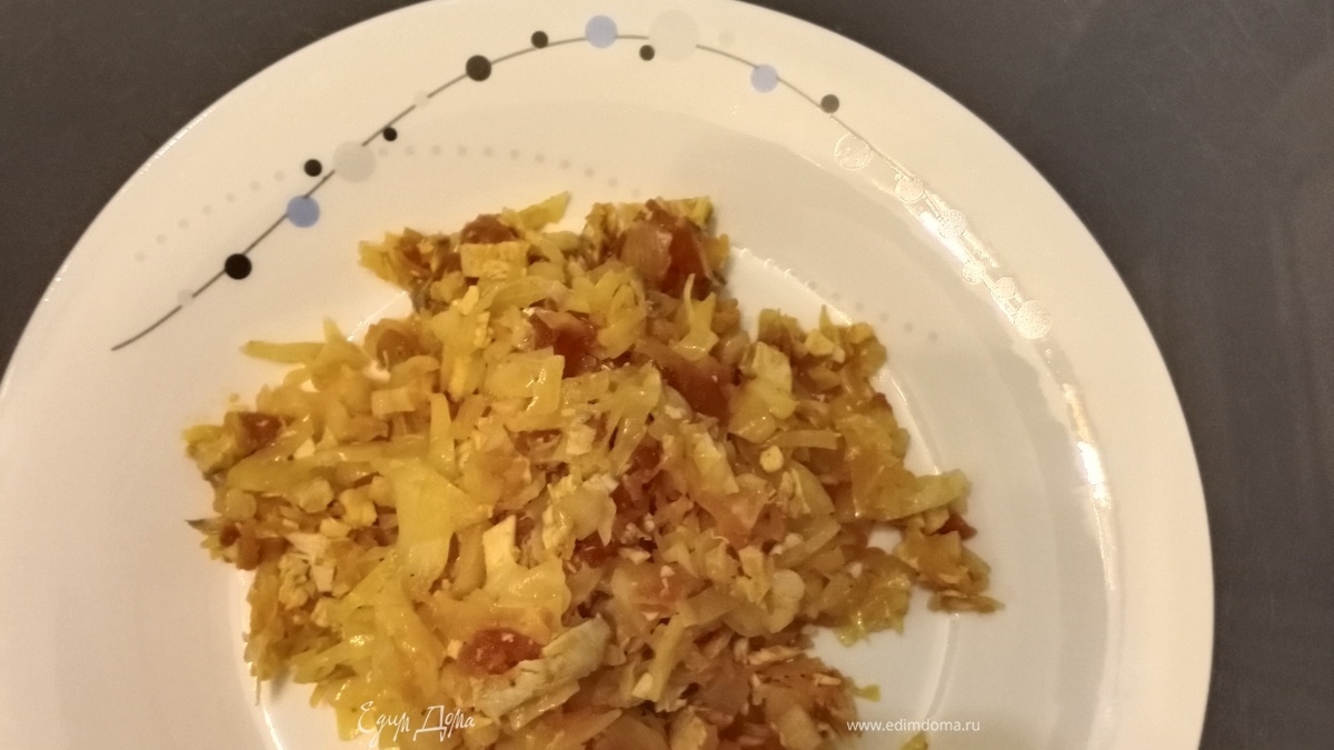 Займемся куриным филе. У меня осталась грудка от запеченной курицы. Ее надо нарезать на небольшие кусочки и отправить к овощам. Туда же добавить измельченные томаты из банки, все хорошо перемешать и оставить под крышкой тушиться минут на 15–25. Ориентируйтесь на желательную для вас готовность капусты. Приятного аппетита!