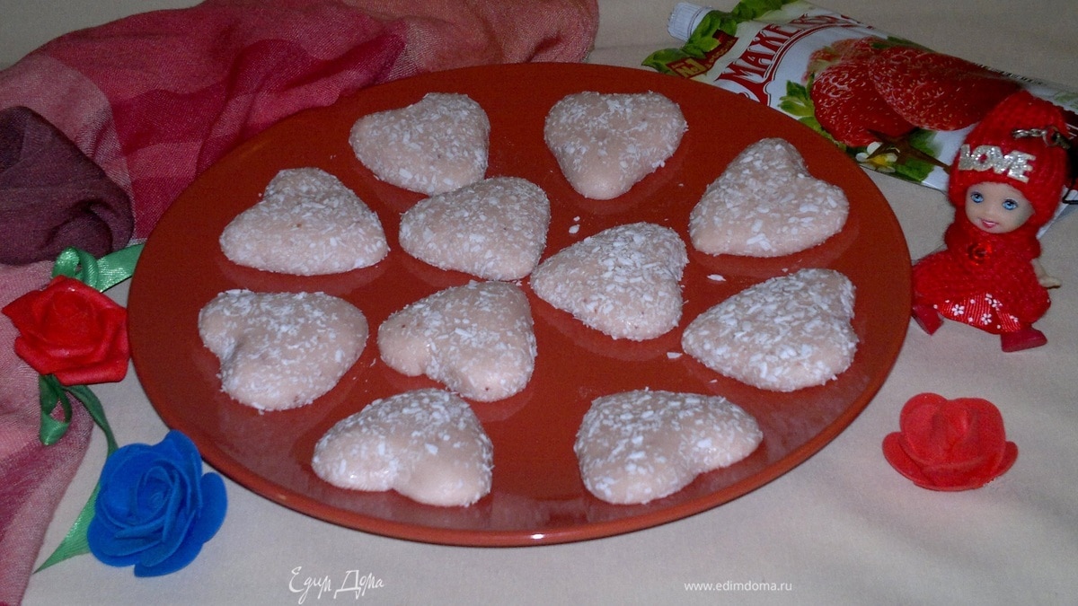 Достать шарики из холодильника. Из каждого шарика сформовать сердечко, обвалять в кокосовой стружке. Можно взять розовую, но у меня на тот момент не оказалось. - Шаг 6