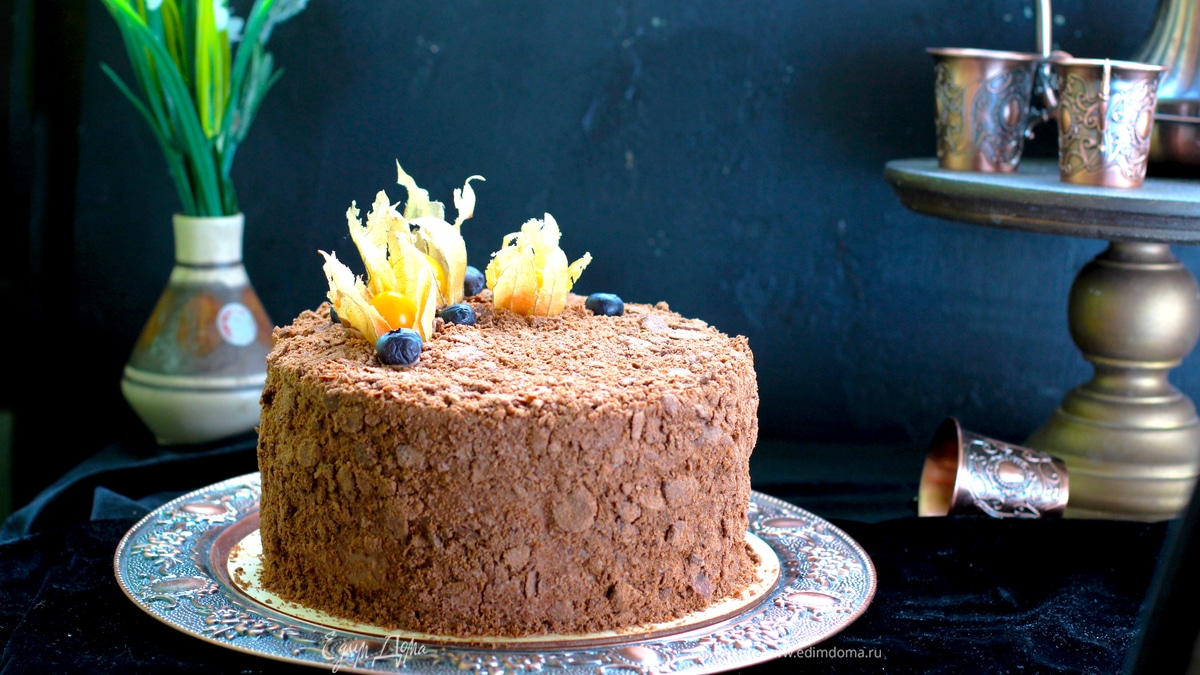 Собрать торт, обернуть ацетатной пленкой и затянуть в кольцо. Поставить груз и убрать на 1 час в холод. Покрыть торт остатками крема, посыпать толченой крошкой и снова убрать на 6–8 часов для пропитки.