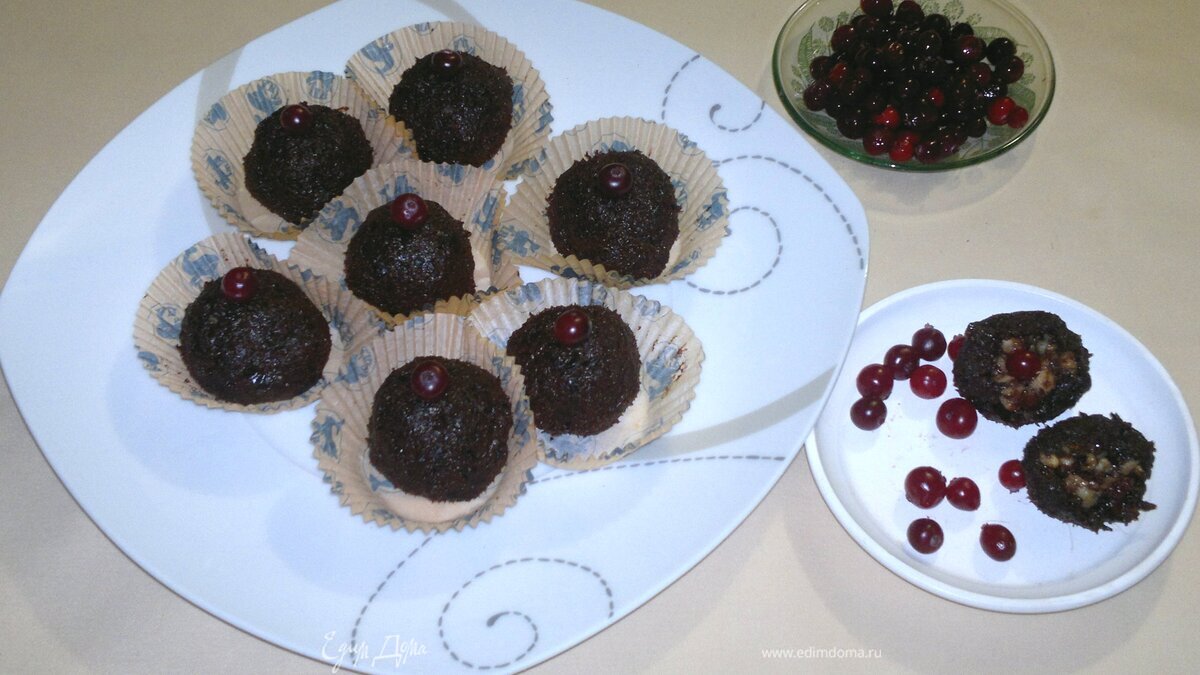 Выложить конфеты на блюдо. Каждую конфету украсить ягодкой клюквы. Угощайтесь! Приятного аппетита!