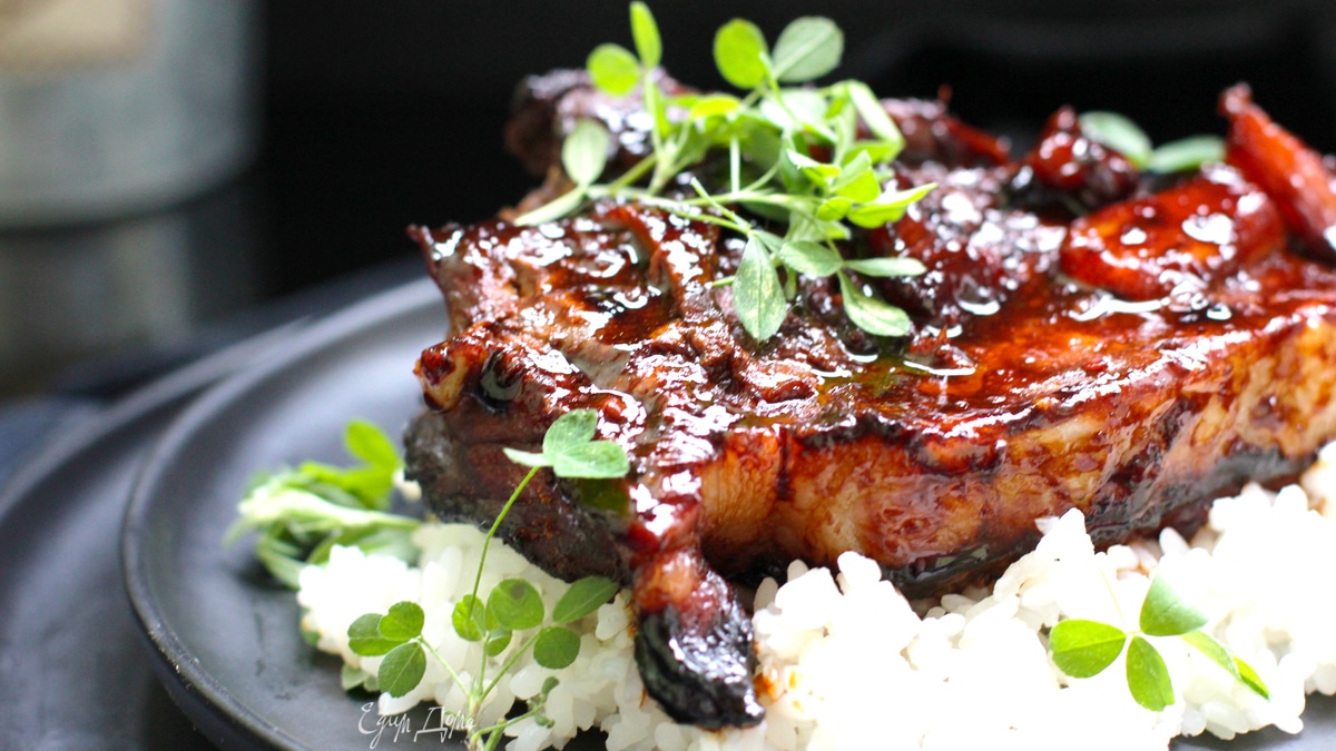 Эта свинина, бесспорно, азиатская по составу, но вместо долгого маринования и быстрой обжарки тут использован принцип долгого запекания при относительно низкой температуре.