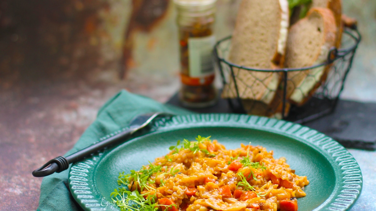 Добавить промытый круглый рис и воды в 1,5 раза по объему больше, чем риса. Закрыть крышкой и тушить до готовности риса. Блюдо посыпать зеленью петрушки.