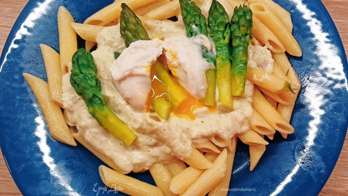 Выкладываем пасту на тарелку. Сверху — соус, можно заранее перемешать. Украшаем головками спаржи, сверху можно положить яйцо пашот, с ним еще вкуснее. Здесь можно посмотреть, как быстро его приготовить: ссылка на рецепт Bon appétit!