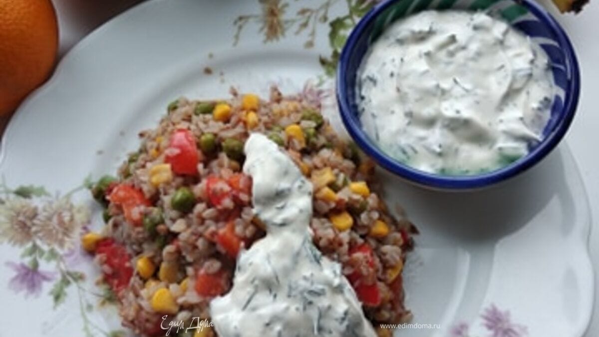Тем временем готовим соус. Смешиваем сметану и майонез, добавляем пропущенный через пресс чеснок, подсаливаем, если нужно. Мелко шинкуем укроп и добавляем в соус. Когда греча готова, поливаем соусом и подаем с мясом или как самостоятельное блюдо. Приятного аппетита!