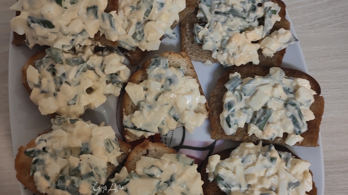 Разрезать гренки на две половинки. Выложить салат на гренки. Готово!