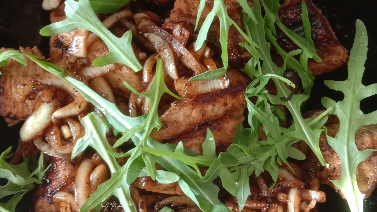 Готовый шашлык выкладываем на тарелку и украшаем руколой. Приятного аппетита!