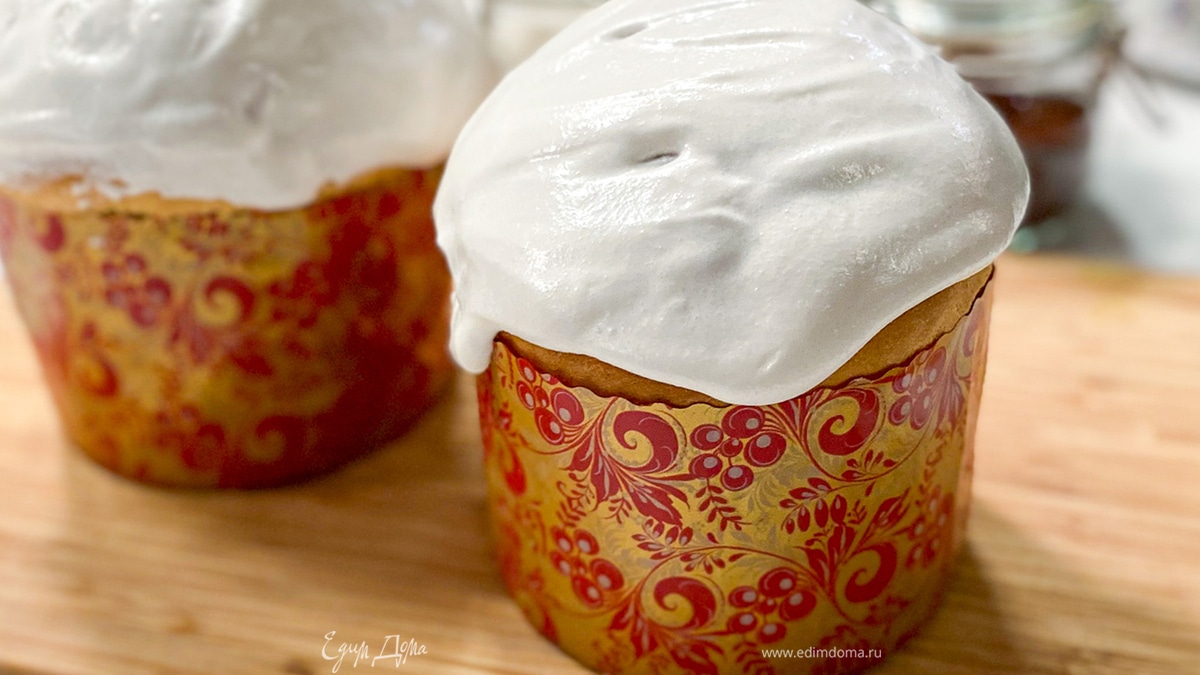 Приготовить глазурь, взбив белки с сахарной пудрой, и сразу нанести на теплые куличи.