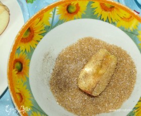 В тарелке смешиваем сахар и корицу. И обваливаем яблочные дольки.