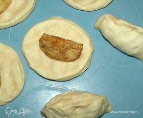 На круг выкладываем яблочную дольку и защипываем тесто.