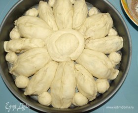 Выкладываем в форму наши заготовки, предварительно застелив низ формы пекарской бумагой, смазанной растительным маслом. У меня форма диаметром 26 см. В центре делаем круглую заготовку и выкладываем швом вниз. Заполняем пространство между фрагментами пирога шариками из теста.