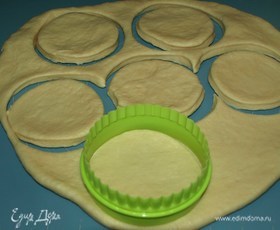Тесто должно получиться очень легким для работы и не липнуть к рукам. Готовое тесто раскатать в пласт. Вырезать формой для печенья круги. У меня форма диаметром 9 см. Собираем обрезки теста и тоже раскатываем.