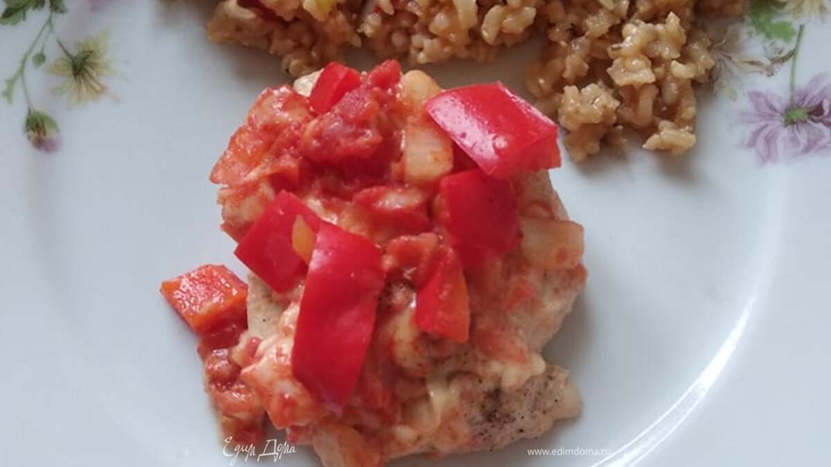 Куриное филе нарезать на порционные куски, слегка отбить, посолить и поперчить. Выложить в смазанную оливковым маслом форму. Сверху выложить смесь овощей с сыром. - Шаг 4