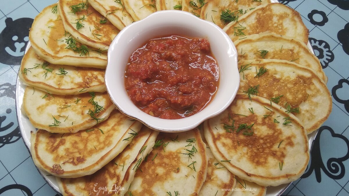 Сковороду смазать тонким слоем масла. Выпекать на среднем огне с двух сторон, выкладывая смесь столовой ложкой. У меня получилось 22 оладушка. Посыпать зеленью и подавать с любимыми соусами и приправами. Прекрасно сочетается с аджикой. Приятного аппетита!