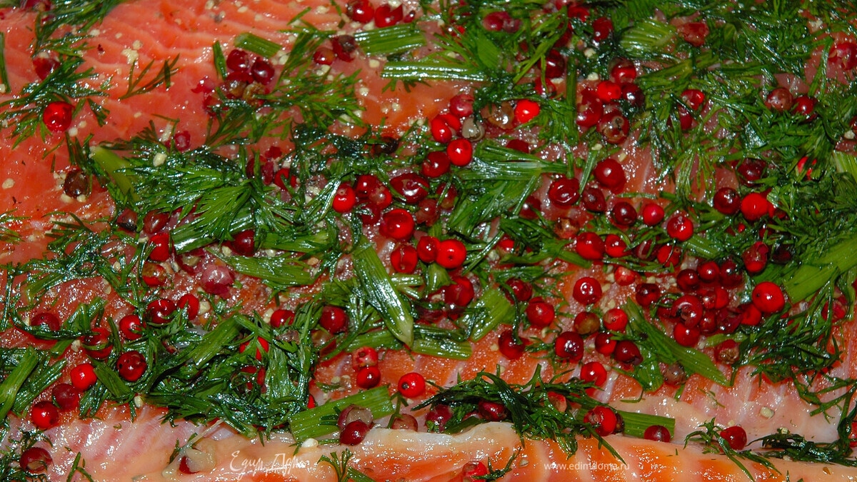 Филе выложить на кулинарную бумагу кожей вниз. Равномерно обсыпать крупной солью, затем сахаром. Укроп крупно порубить и выложить поверх филе. Добавить ягоды сушеной брусники. - Шаг 1
