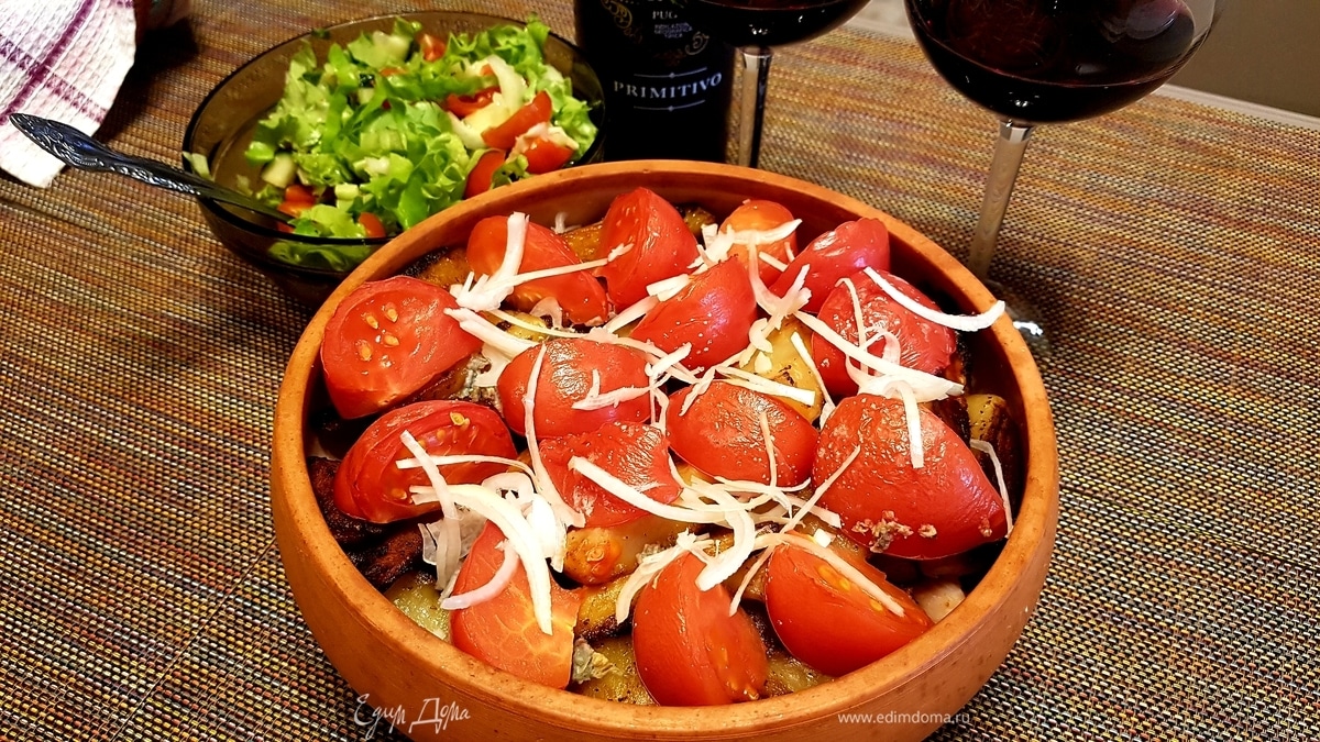 Помидоры нарезать крупными дольками и выложить сверху картофеля. Запекать в духовке 20 минут при 200°C. - Шаг 7