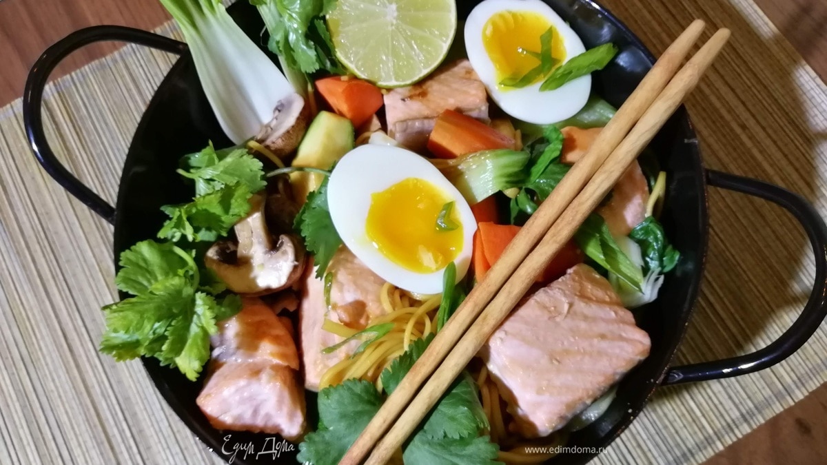 Теперь можно сервировать. Боулы традиционно подают в больших глубоких пиалах. Выложить лапшу с овощами, сверху — кусочки лосося, половинки яиц, затем посыпать свежей кинзой и зеленым луком. Добавить жареный арахис. - Шаг 7