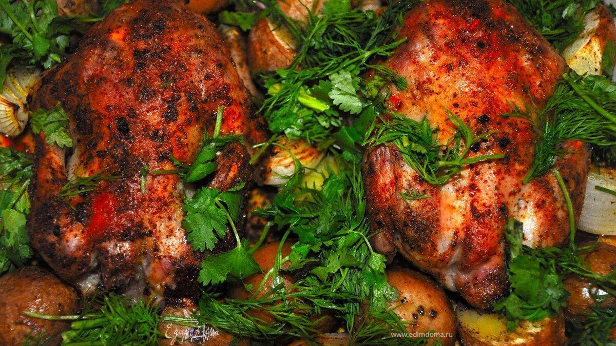 В разогретую до 250 гр. духовку поставить жаркое и запечь при температуре 180гр. 1 ½ часа. Готовых цыплят посыпать свежей зеленью и подать к столу. - Шаг 3